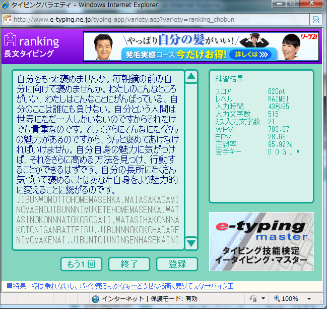 じゃなくて、e-typing長文のWPMは703でした